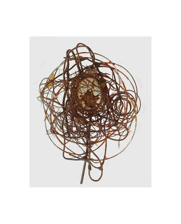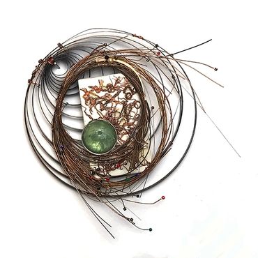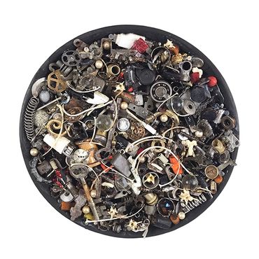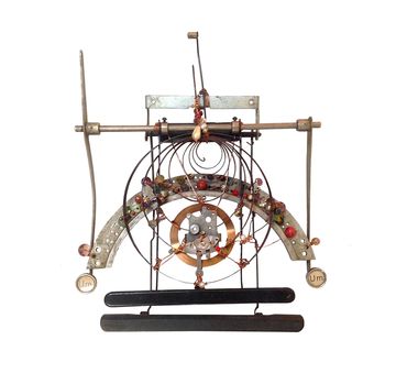 The predominant materials for these pieces are old typewriter, adding machine and watch parts, costume gems, tiny reclaimed objects , bones and copper wire.
