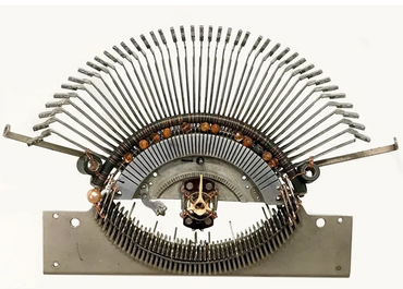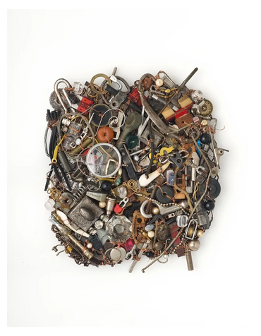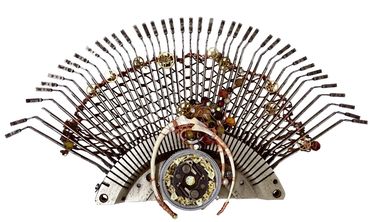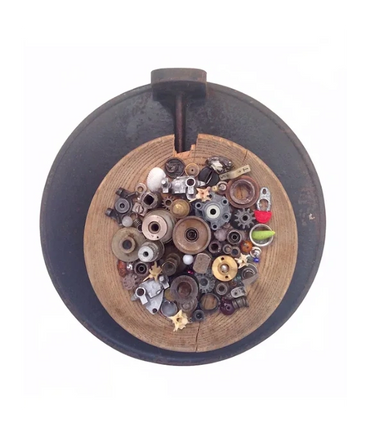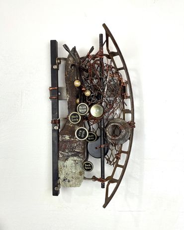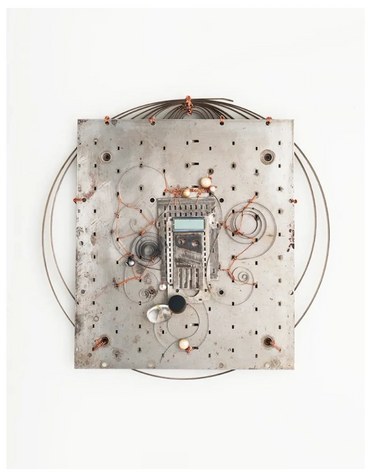 I've always been fascinated with the origins of writing based on Bronze Age archeology and pre-historic cave art. Influenced by the connection between the shapes that early humans used to visually communicate and their echo in analog technology, I started to create panel displays that read like hieroglyphics using found objects mined from old machines.